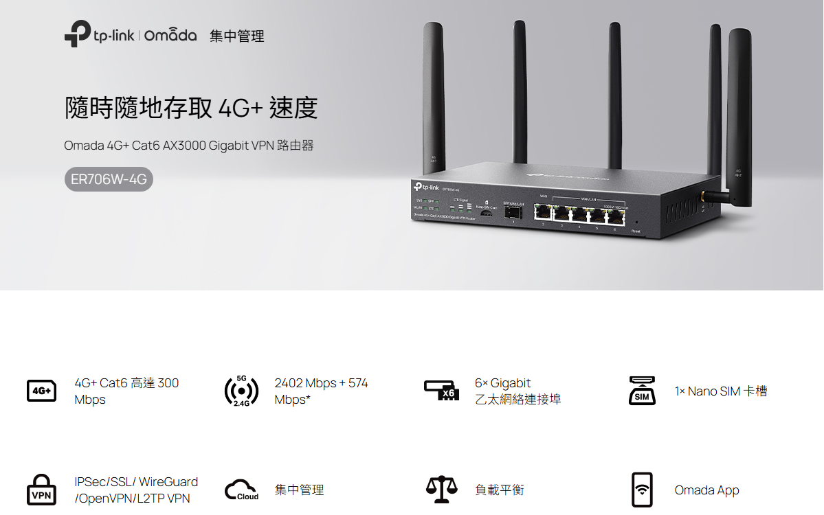 | 包裝內容 | • ER706W-4G • 電源變壓器 • 快速安裝手冊 |