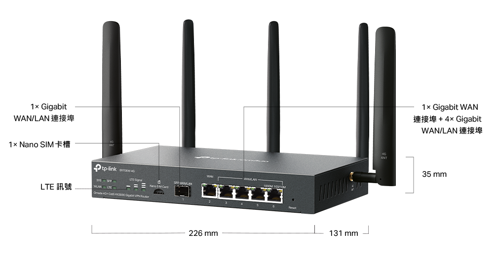 | LED燈 | SYS, WLAN, SFP, LTE 訊號, WAN (1000M Link/Act, 100/10M Link/Act), WAN/LAN (1000M Link/Act, 100/10M Link/Act) |